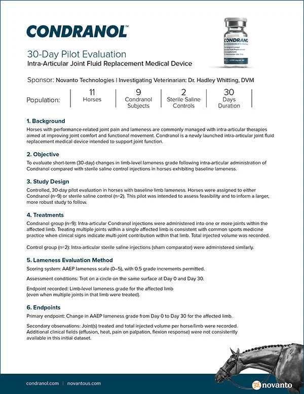 Condranol™ was evaluated in a controlled 30-day pilot study designed to assess short-term changes in limb-level lameness following intra-articular administration in horses with baseline performance-related joint pain. The evaluation included Condranol-treated subjects and sterile saline controls, with lameness assessed at baseline and Day 30 using the AAEP lameness scale under consistent conditions. This pilot was conducted to assess study feasibility and to inform the design of larger, more robust clinical investigations.